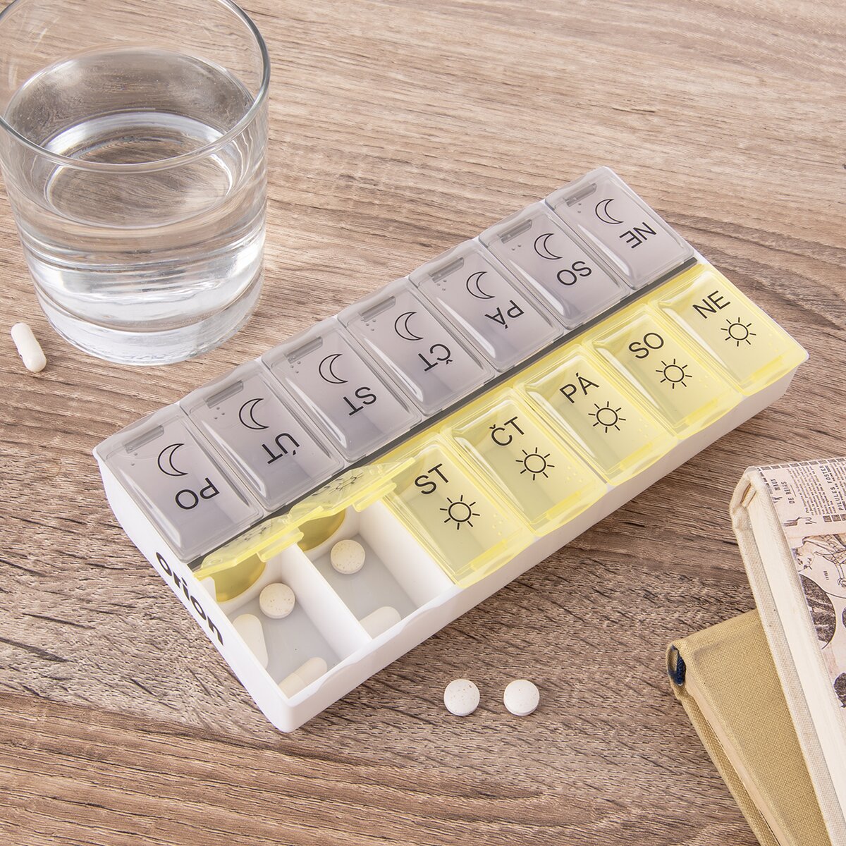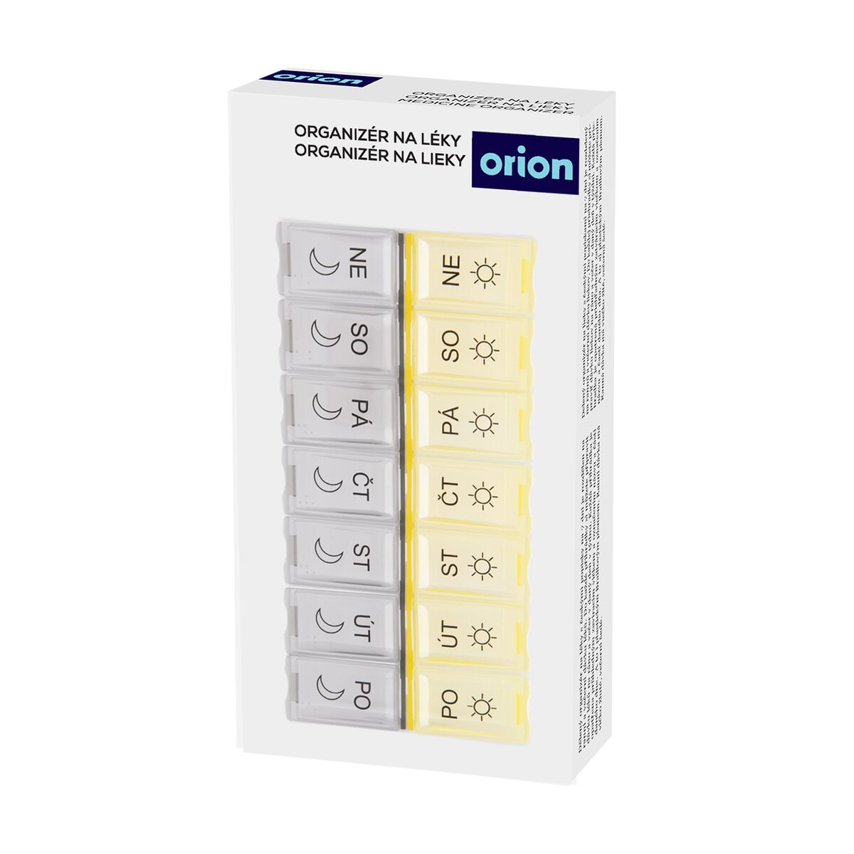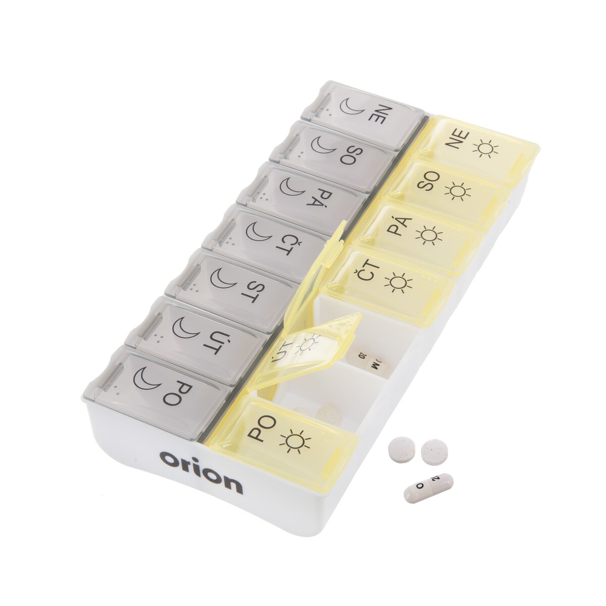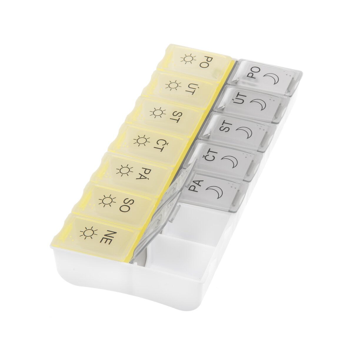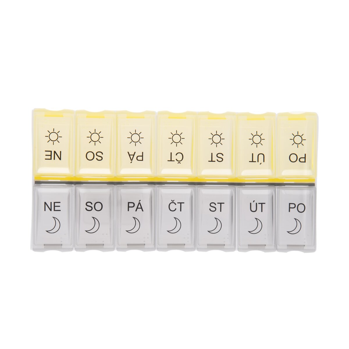 Kód produktu 811260Delený organizér na lieky s CZ popiskami na 7 dní je rozdelený na rannú a večernú dávku liekov. Do každej priehradky si môžete pripraviť dávku liekov na ráno a večer v daný deň v týždni. Každá priehradka je opatrená priehľadným zatváracím viečkom a označením názvu a častí daného dňa. A to aj plastickým Braillovým písmom. Ranná dávka má viečko žlté, večerná šedé. Materiál: plast PP. Rozmery: organizér 18x9x3,2 cm, jednotlivá časť 3,7x2,5x3 cm.
