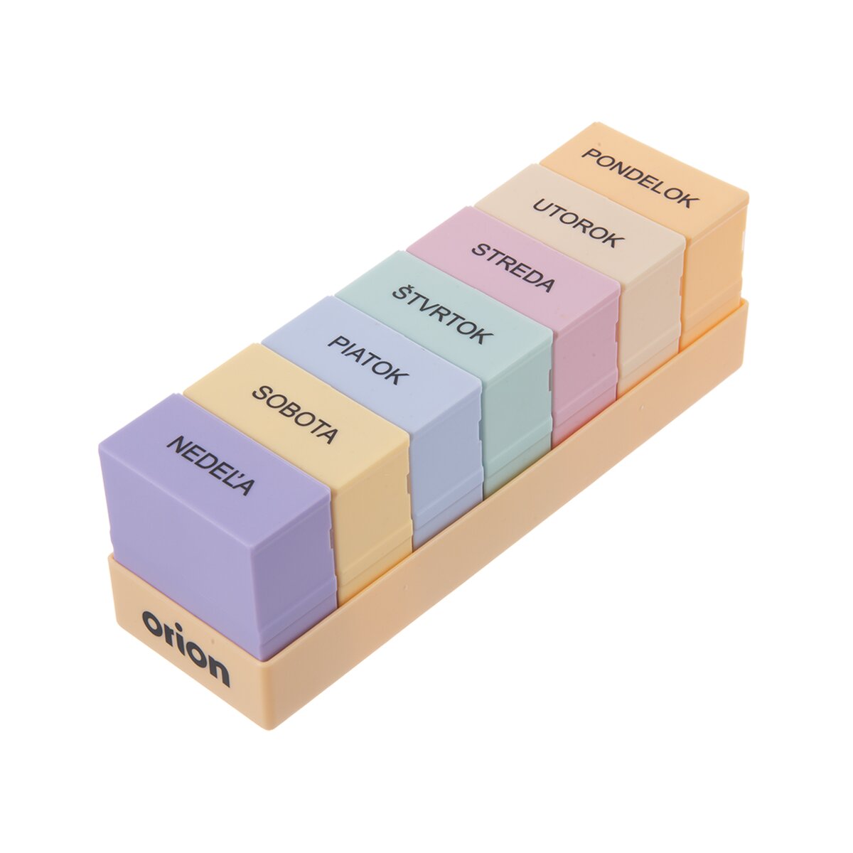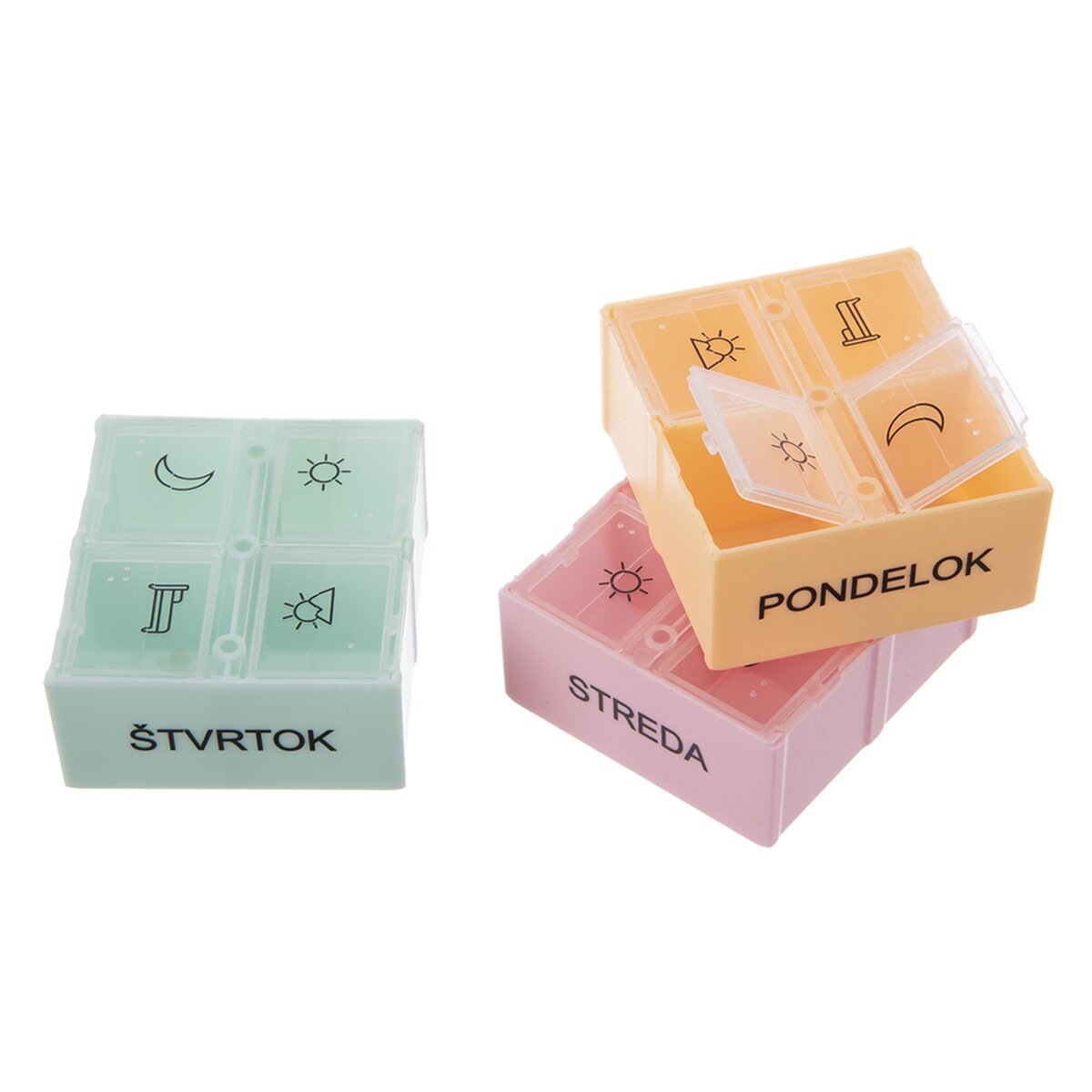 Kód produktu 811265Hranatý plastový organizér na uloženie liekov na celý týždeň má vyberateľné štvordielne sekcie so zatváracími viečkami. Sú rôznofarebné a prehľadne potlačené.
