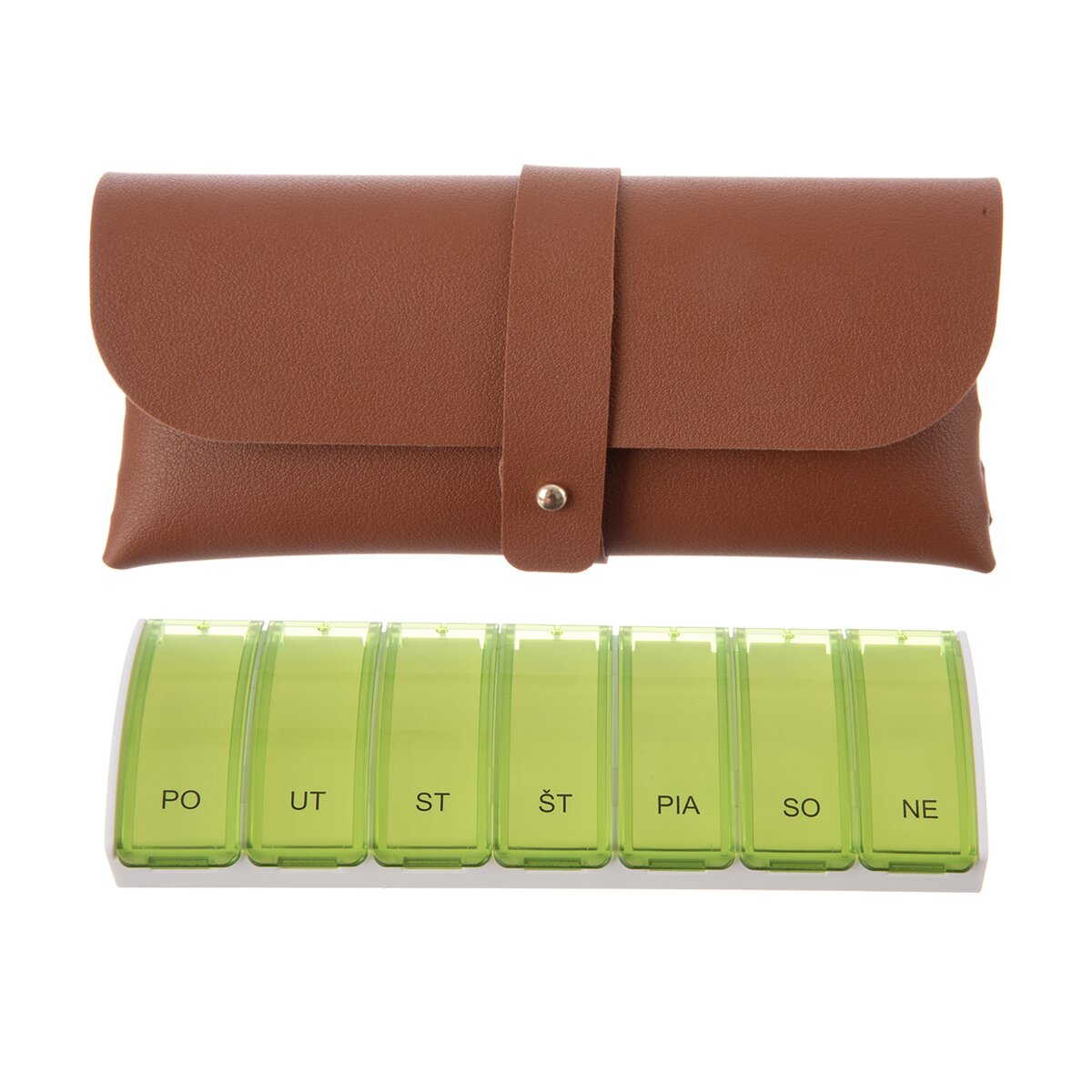 Organizér je vyrobený z plastu PP a uložený v elegantnom puzdre (PU a kov), takže aj na služobnej ceste, na dovolenke alebo pri pobyte u priateľov a známych budú lieky nenápadne uložené.