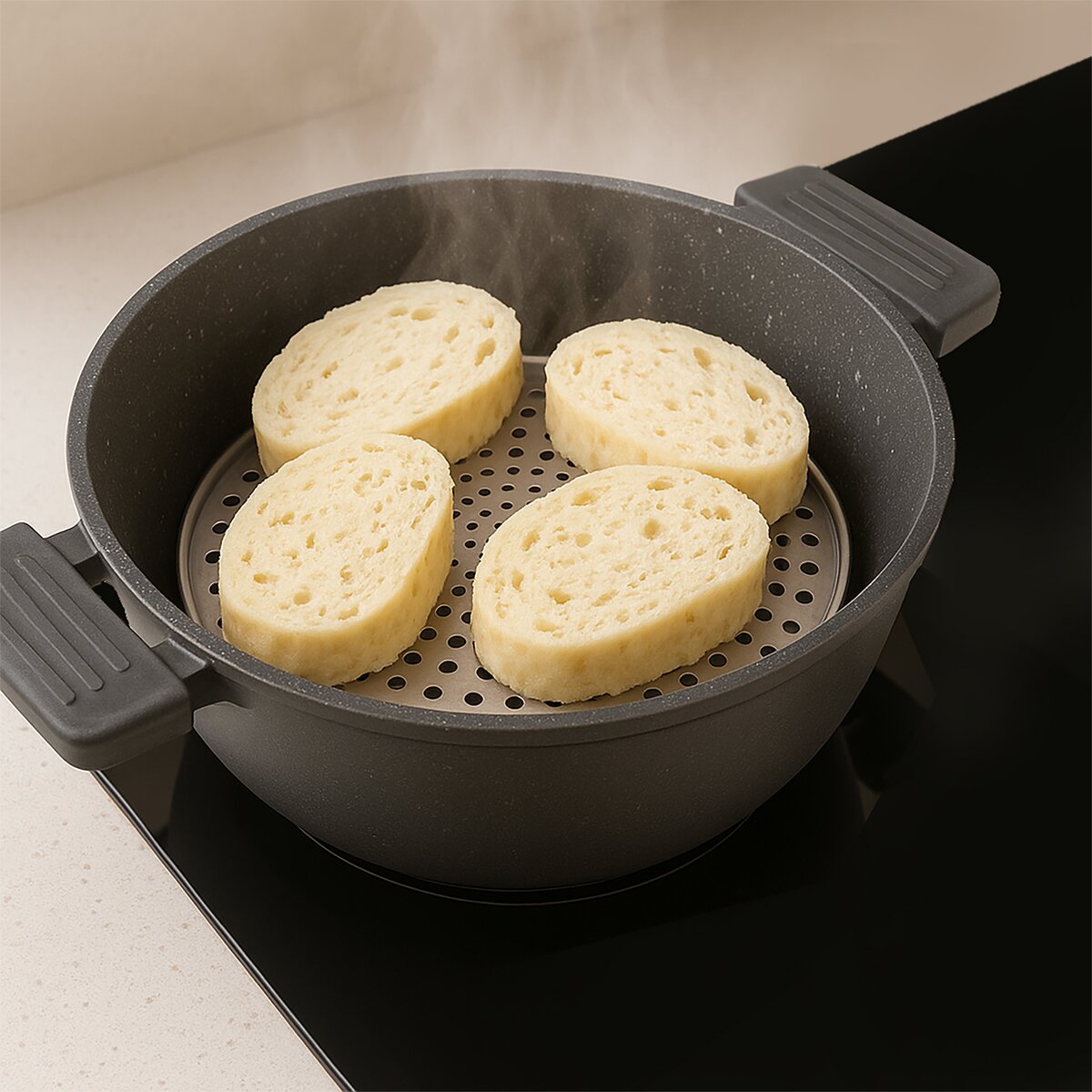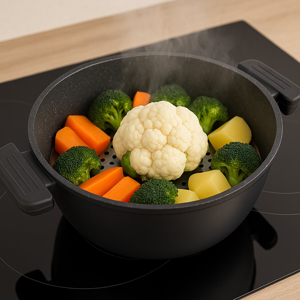 Kód produktu 152221Paráčik do hrnca je praktická pomôcka určená na varenie jedla v pare, čo je šetrnejšia metóda ako klasické varenie vo vode. Použitie je jednoduché - paráčik sa vloží do hrnca s vrstvou vody tak, aby hladina vody zostala pod jeho dnom. Po zahriatí začne voda vytvárať paru, ktorá jedlo rovnomerne a šetrne prehrieva. Paráčik je vybavený sklápacím úchytom pre ľahšiu manipuláciu pri vkladaní aj vyberaní z hrnca. Je ideálny na prípravu zeleniny, ako je brokolica, karfiol alebo mrkva – zelenina si zachová svoju farbu, chuť i cenné výživové látky. Skvele sa hodí aj na zemiaky, ktoré sa pri naparovaní nerozvaria, čo oceníte napríklad pri príprave zemiakového šalátu. Paráčik využijete aj na knedle, ryby a morské plody, ktoré vďaka pare zostanú jemné a chutné. Praktické je tiež použitie na ohrievanie jedla bez potreby mikrovlnnej rúry. Je vhodný do umývačky. Materiál: nerezová oceľ. Rozmery: pr. 19,5 cm, celková š. 20 cm, v. 5,1 cm.