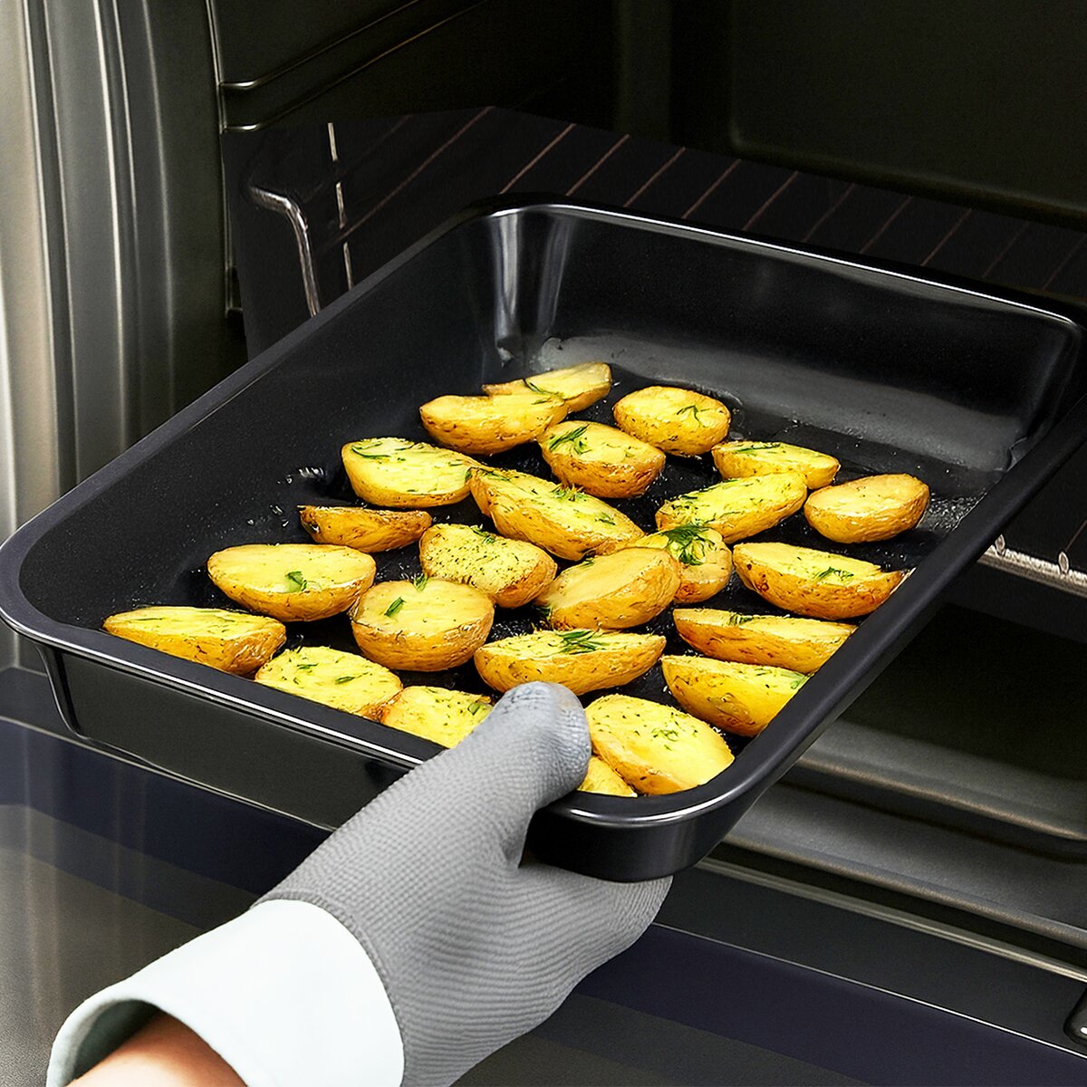 Kód produktu 127049Hlboký smaltovaný plech veľkosti 40,8x31,8x6 cm je ideálny na pečenie sladkých a slaných pokrmov, na zapekanie, gratinovanie alebo sušenie v rúre a je možné ho umývať v umývačke riadu.