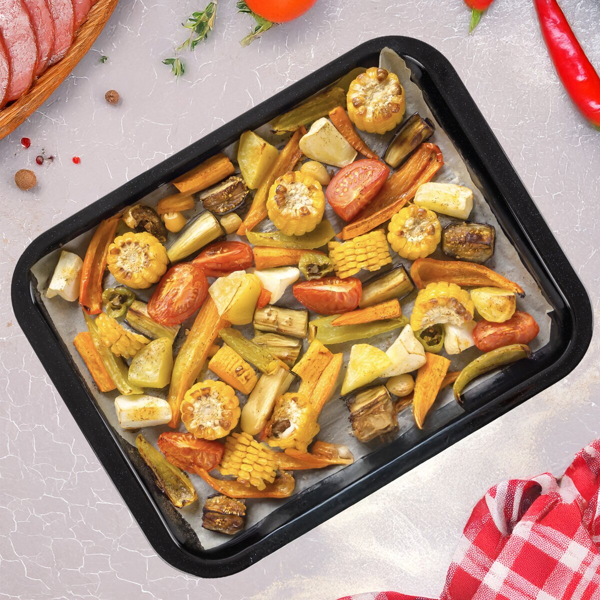 Plech na pečenie so smaltovaným povrchom používali už naše babičky a aj naďalej má v kuchyni svoje stále miesto. Smalt je sklovitý materiál na báze roztaveného skla, ktorý je zdravotne nezávadný a neuvoľňuje žiadne škodlivé látky do potravín. Je odolný voči kyselinám, zásadám aj vysokým teplotám, čo z neho robí ideálnu voľbu na pečenie v rúre. Hladký povrch plechu sa ľahko čistí, neabsorbuje pachy ani chute a má dlhú životnosť.