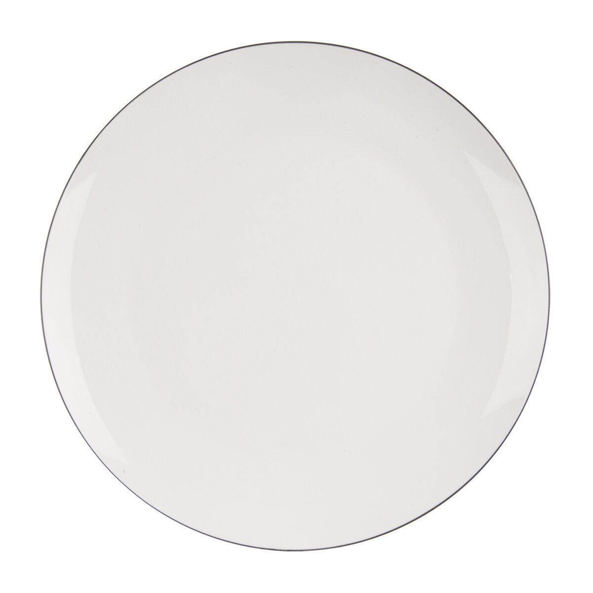 Kód produktu 129173Elegantný porcelánový plytký tanier má hladký biely povrch a je zdobený jemnou čiernou linkou po okraji, ktorá podčiarkuje jeho vycibrený vzhľad. Ideálny štýlový doplnok pre každú domácnosť. Materiál: New Bone China - veľmi kvalitný, pevný a odolnejší ako bežný porcelán. Rozmery: pr. 27,5 cm. Možno umývať v umývačke a použiť v MVR.
