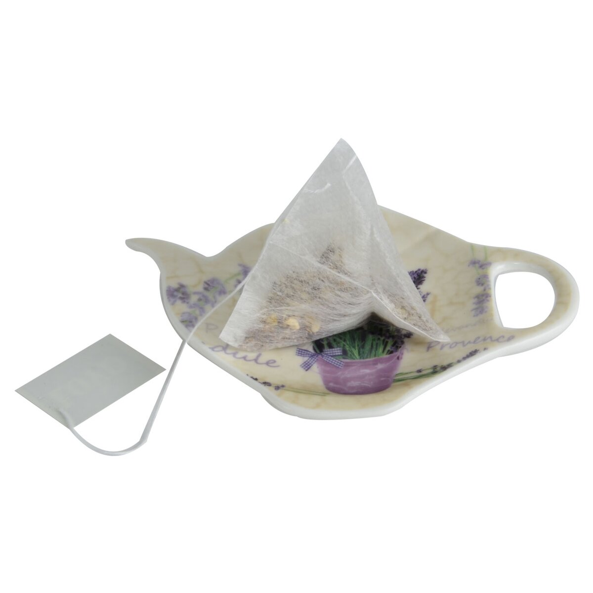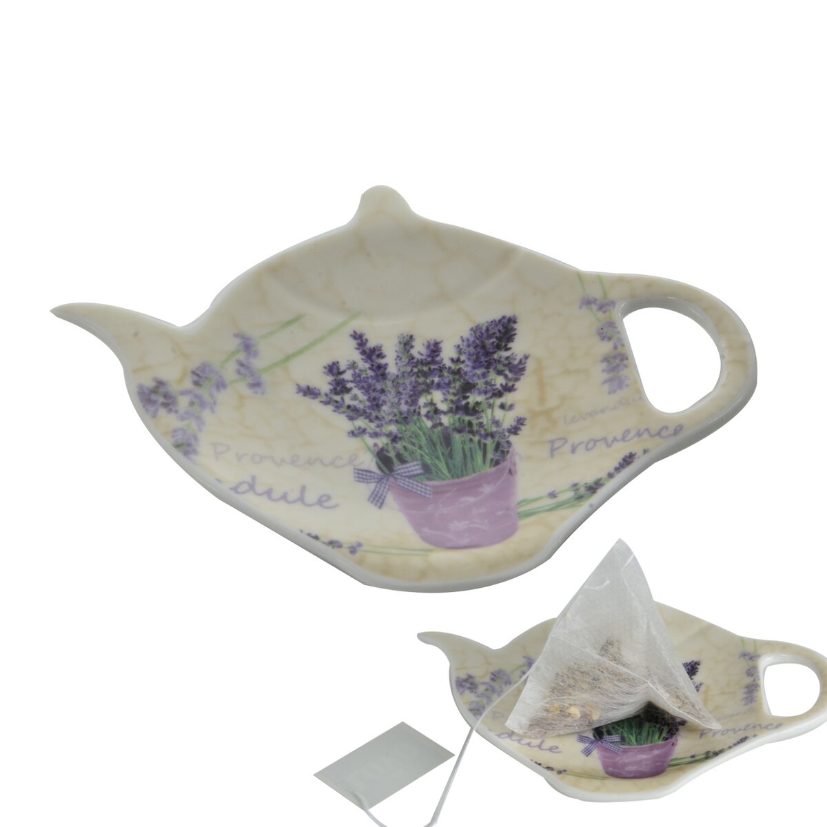Kód produktu 125425Tácka v tvare kanvičky - podčajník na odloženie vylúhovaného čaju z hrnčeka. Materiál: porcelán. Dekór LEVANDULE. Rozmery: 11,5x9x1,5 cm.