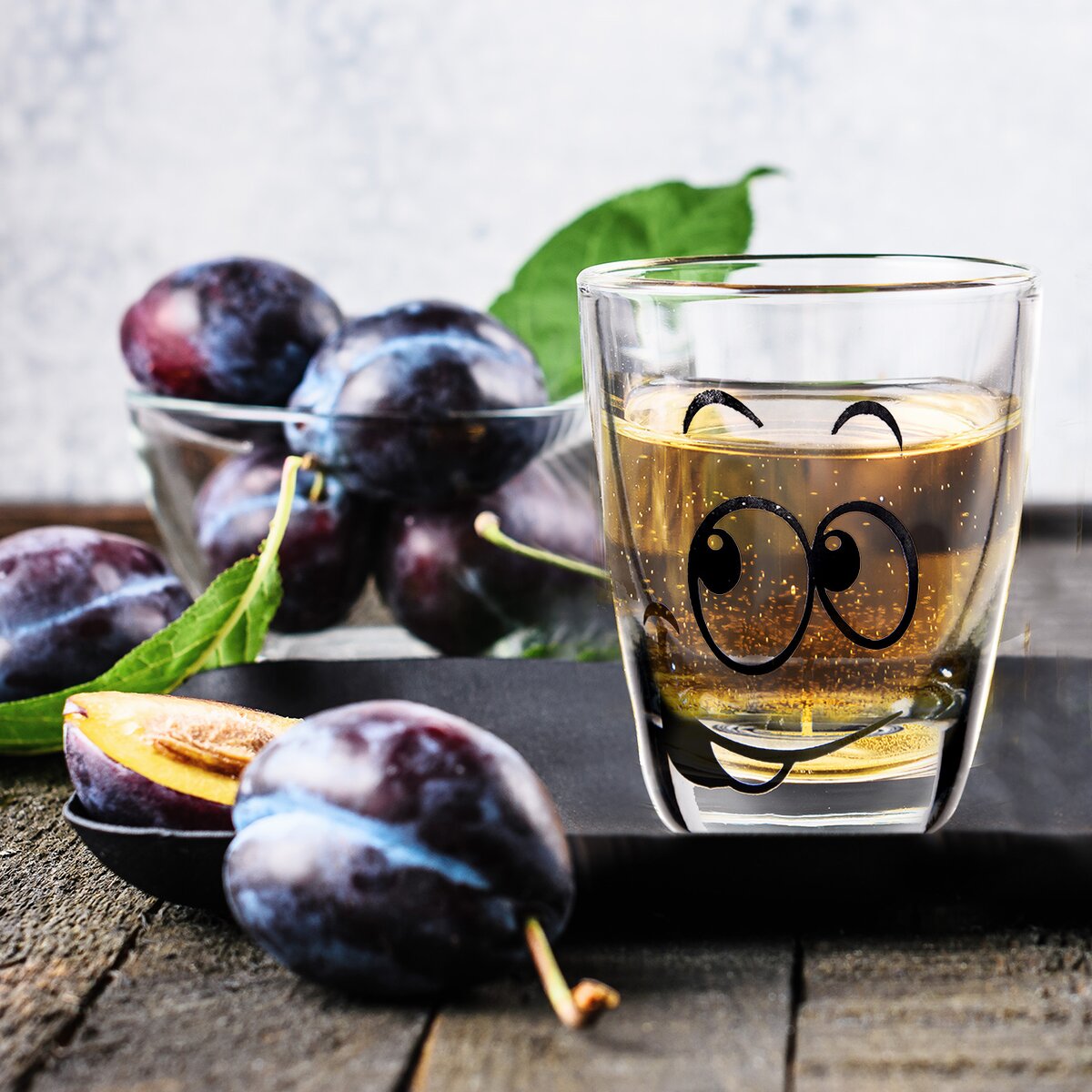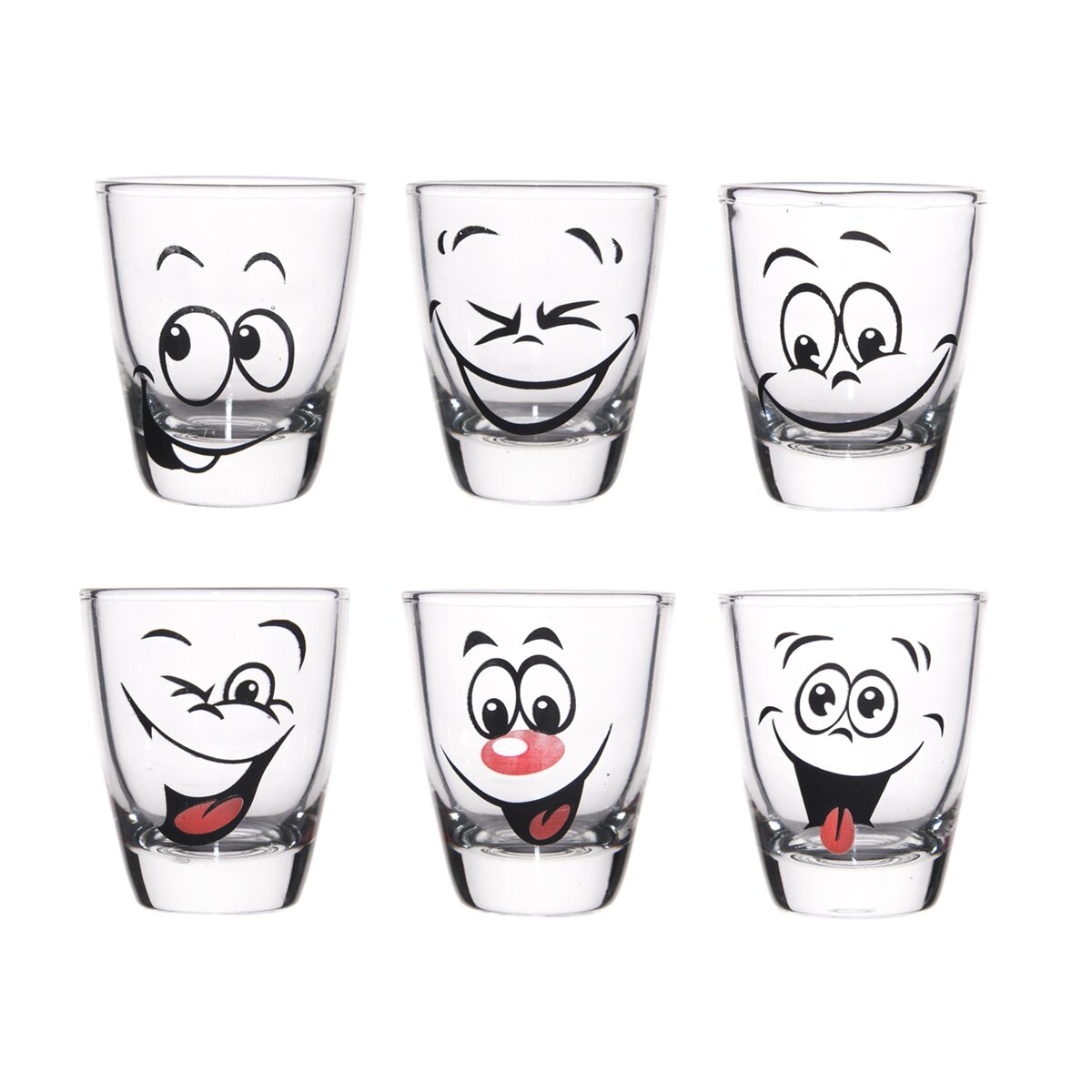 Odlievka s dekórom tváre. Materiál: sklo. Súprava 6 ks. Rozmery: objem 0,025 l, pr. 4 cm, v. 5 cm.