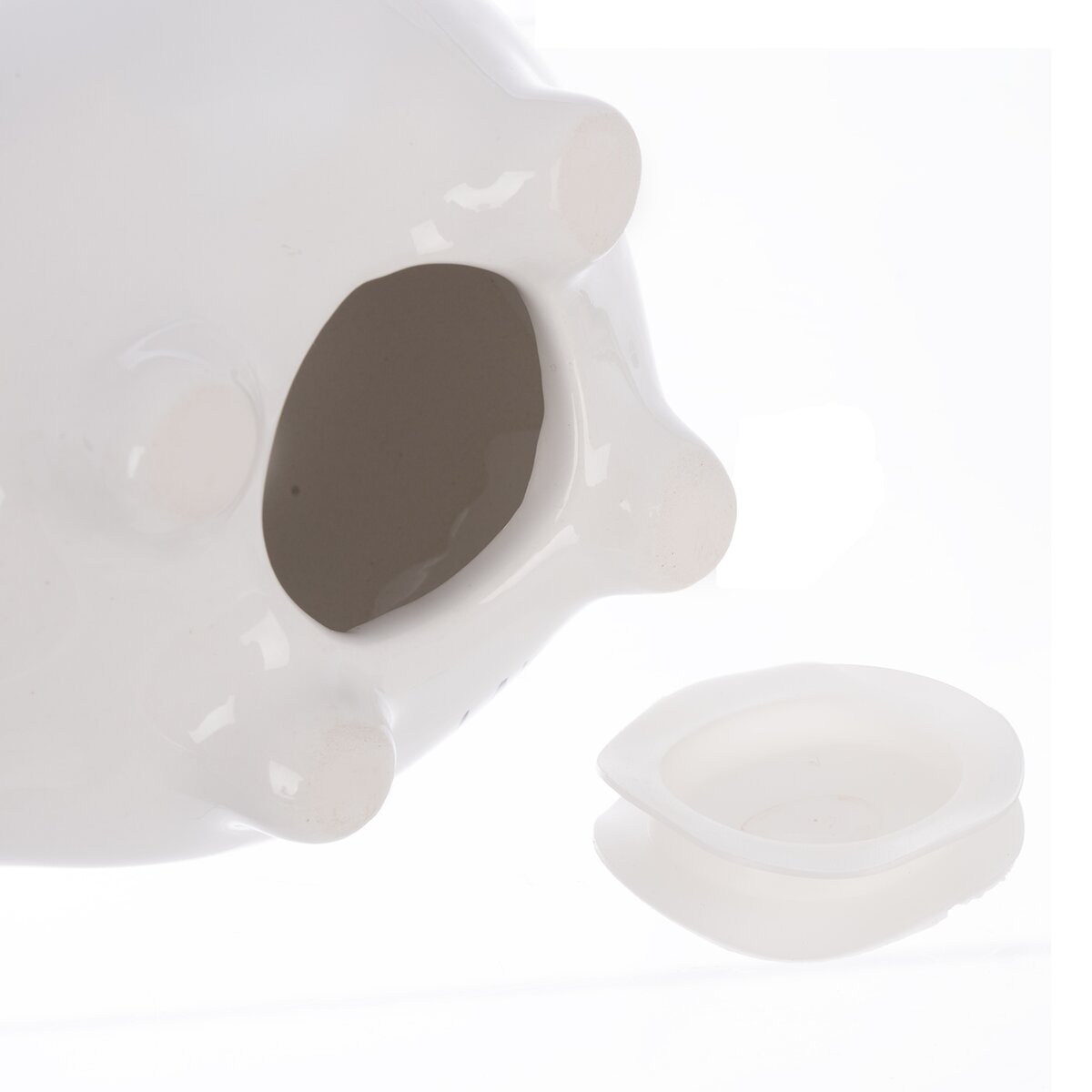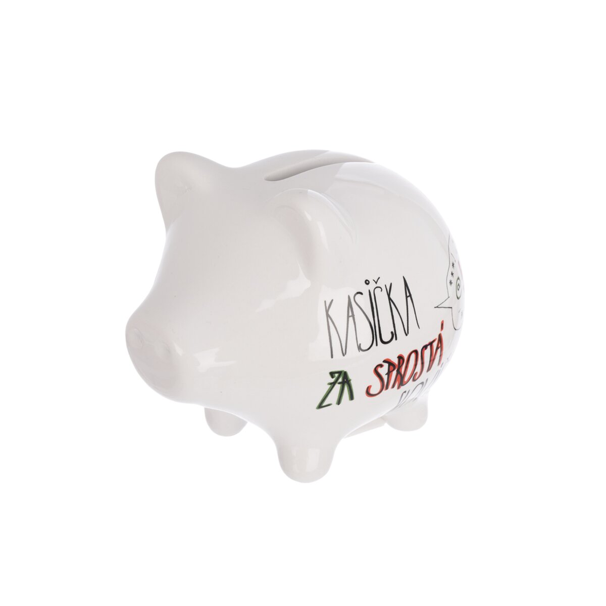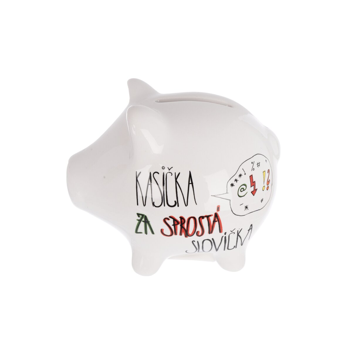 Kód produktu X14581Biela keramická pokladnička v tvare prasiatka s nápisom „Kasička za sprosté slovíčka“ prináša do domácnosti aj kancelárie zábavu a motivuje k lepšiemu slovníku. Každé peprné slovíčko znamená príspevok do pokladničky, čo z nej robí ideálny doplnok pre domáce pobavenie, firemné prostredie alebo ako originálny darček pre kamaráta s prerezaným jazykom. Vďaka svojmu hravému a štýlovému dizajnu pobaví a rozosmeje každého. Zospodu je opatrená praktickou zátkou pre ľahké vybratie úspor. Materiál: keramika. Rozmery: 11x9x9 cm. Designed by Orion.