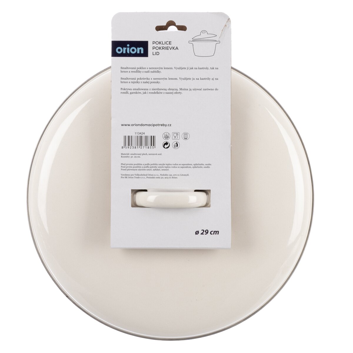 Kód produktu 113424Pokrievka smaltovaná s nerezovým lemom. Využijete ju na kastróly aj na hrnce (napr. na hrniec 113351). Materiál: smaltovaný plech, nerezová oceľ. Rozmery: pr. 29 cm. Nie je vhodná do mikrovlnnej rúry. Možno použiť v umývačke riadu a v rúre.