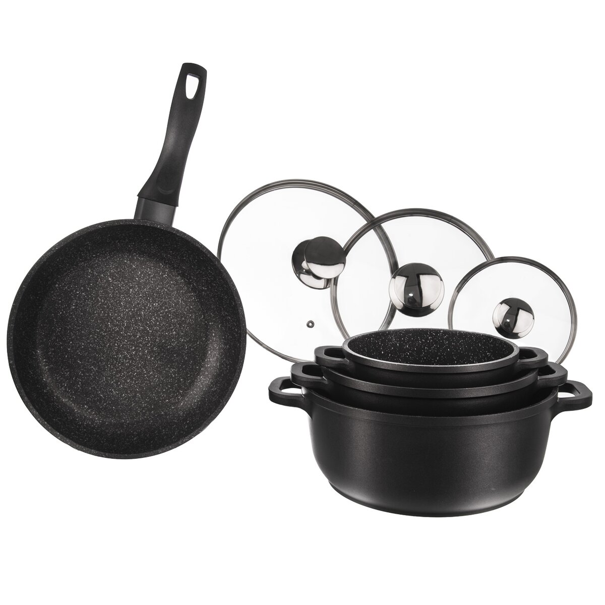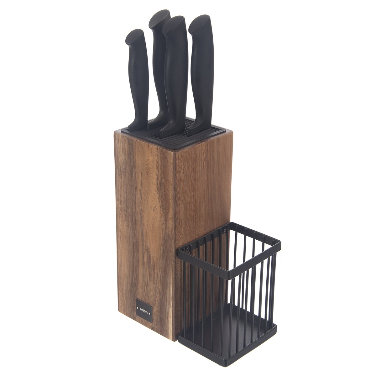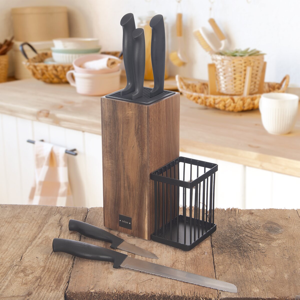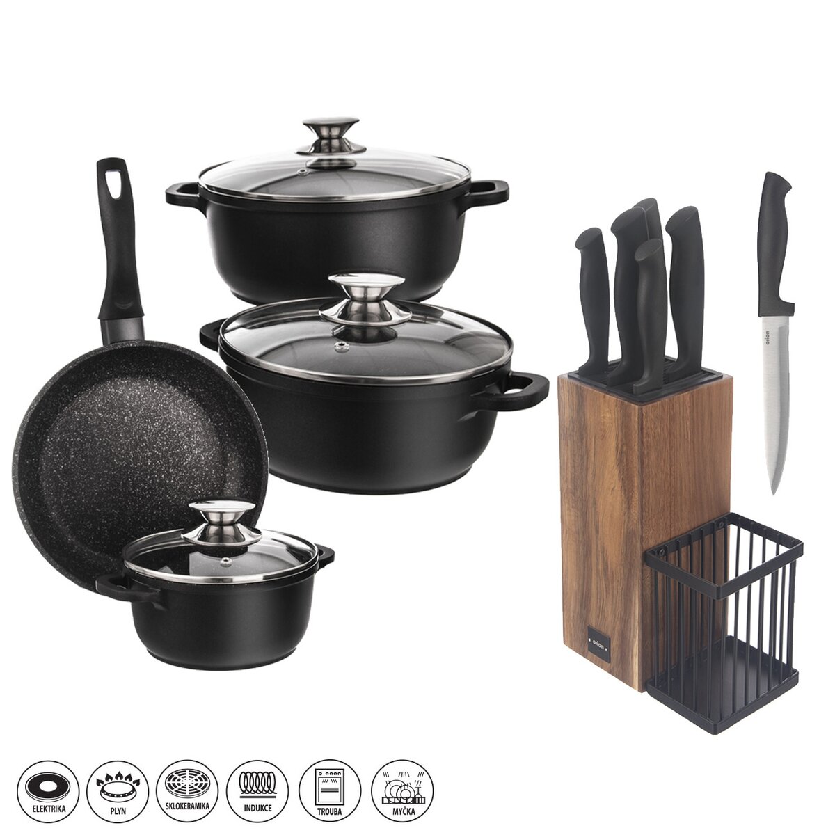 Kód produktu 113380Sada riadu – masívne hrnce s pokrievkou a panvica s veľmi kvalitným nepriľnavým povrchom PFLUON GRANIT. Môžete v ňom variť, smažiť, dusiť, opekať a zapekať s minimálnou potrebou tuku. Pripravovaný pokrm sa nepripeká. Pokrievky s otvorom pre únik prebytočnej pary. Vhodný na všetky typy spotrebičov vrátane indukcie i rúry (okrem panvice). Materiál: hliník s vynikajúcim nepriľnavým povrchom PFLUON GRANIT a s profilovaným dnom, sklo, nerez, plast. Rozmery: hrniec pr. 16 cm, v. 8/13 cm, o. 1,4 l, hrniec pr. 20 cm, v. 8,5/13,5 cm, o. 2,4 l, hrniec pr. 24 cm, v. 10,5/16 cm, o. 4,2 l, panvica pr. 24 cm, v. 5 cm. Odporúčame použitie kuchynské chňapky. Pri plynových sporákoch voľte správnu veľkosť plameňa, pri elektrických, sklokeramických a indukčných varičov je nutné zvoliť zodpovedajúcu veľkosť platničky. Pripravovaný pokrm možno na sporáku pripraviť a potom ho vložiť do rúry (okrem panvice). Pripravené jedlo môžete pohodlne skladovať v hrncoch tiež v chladničke. Pri použití v rúre s pokrievkou max. do 200 °C. Je vhodná do umývačky na riad. K tomu stojan na nože a kuchynské náčinie je veľmi elegantný a má nadčasový dizajn. Je doplnený 5 nožmi rôznej veľkosti, ktoré umiestnite do gumového vkladu v drevenej časti stojana. Ďalšie kuchynské náčinie (nožnice, brúsku, varešku...) je možné uložiť do kovového postranného košíka. Všetko máte po ruke a nože sa netupia nikde v zásuvkách. Vyzerá veľmi štýlovo, uplatní sa ako v modernej, tak klasickej kuchyni. Jednoduchá údržba. Materiál: akáciové drevo, plast, kov – košík, nerezová oceľ – čepeľ nožov, plast – rukoväť nožov. Rozmery: stojan 16x9x22,5 cm, nože (čepeľ/celková dĺžka) 7,5/18 cm, 12,5/23 cm, 14,5/27 cm, 20/32 cm, so zubatým ostrím 17,5/30 cm. Stojan nie je vhodný do umývačky, nože sú vhodné do umývačky. Po umytí v umývačke dobre vysušte. Častým používaním umývačky dochádza k postupnému tupeniu ostria.