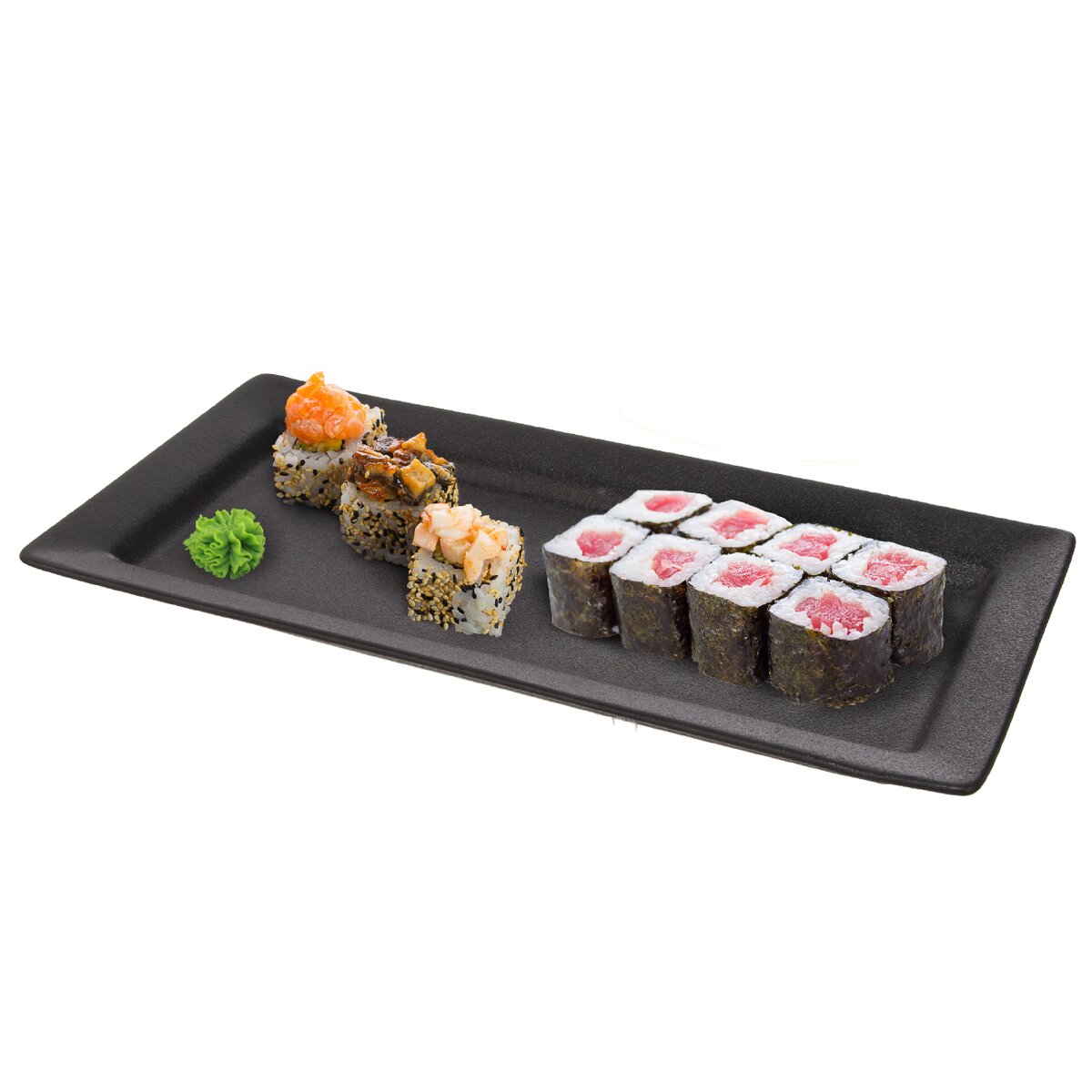 Tácka servírovacia obdlžníková. Materiál: čierny porcelán – hrubý povrch. Možno myť v umývačke na riad. Rozmery: 30x14x2,5 cm.