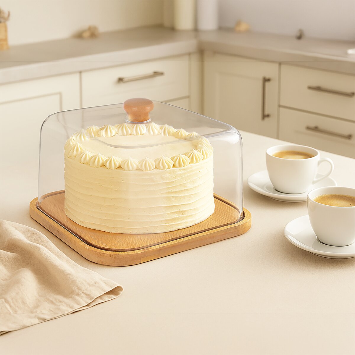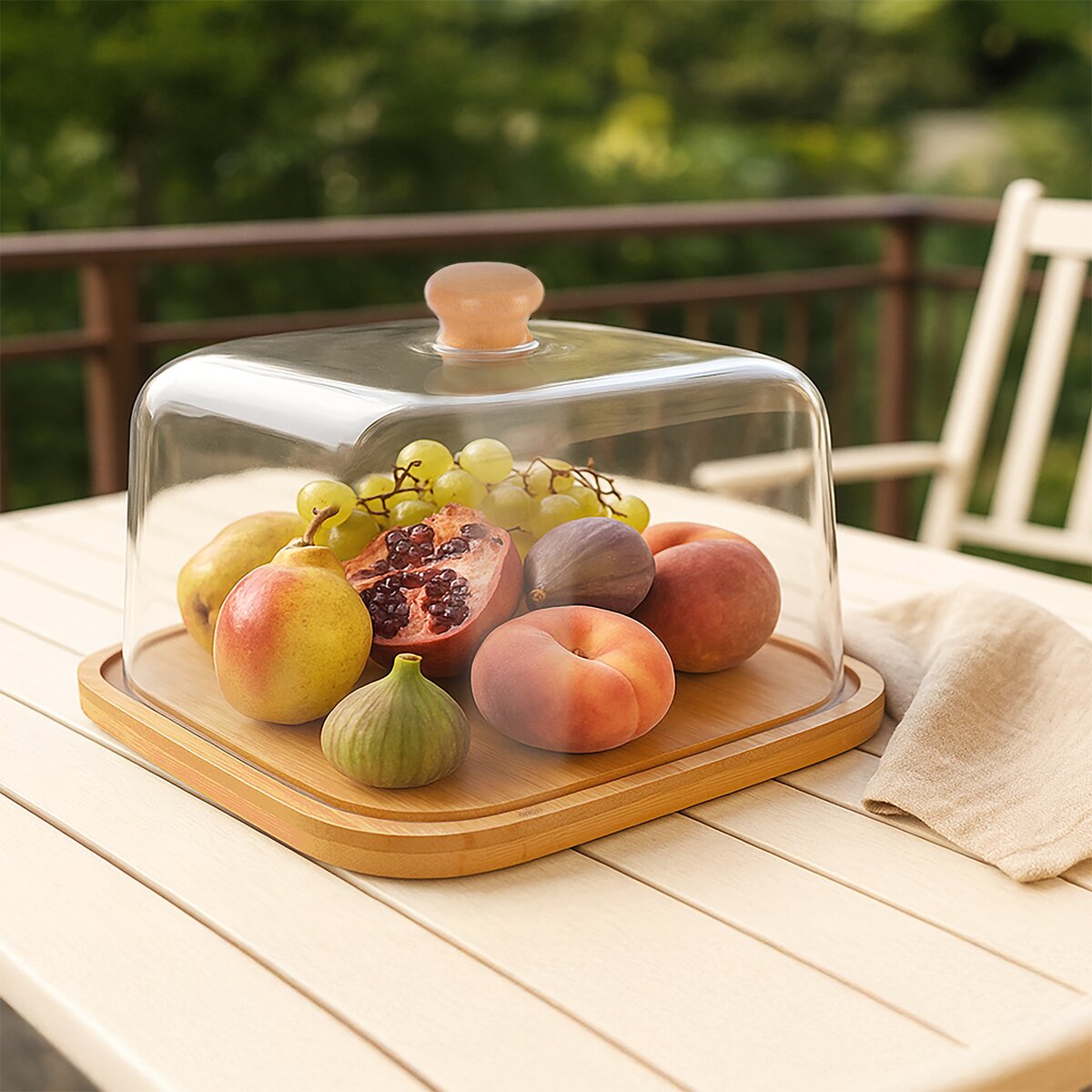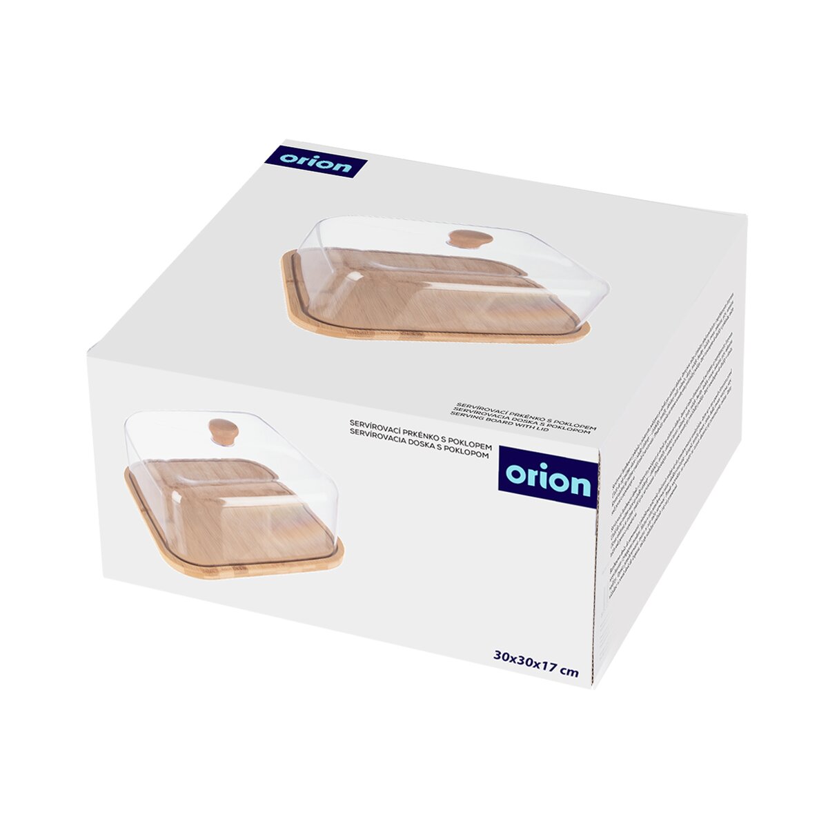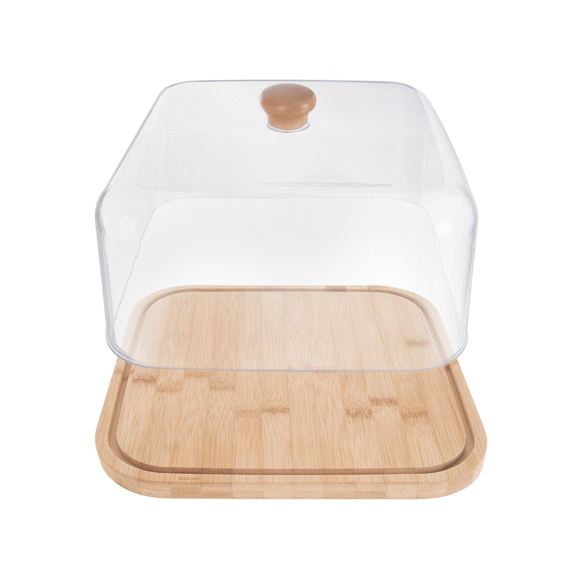 Kód produktu 126855Servírovacia bambusová doska s plastovým poklopom je skvelá na uloženie dobrôt, ktoré sú takto chránené pred oschnutím aj nepríjemným hmyzom. Uložiť do nej môžete slané aj sladké dobroty – chlebíčky, tortilly, obložený tanier, zákusky, torty, rolády, buchty, koláče, ovocie, zeleninu, syry, údeninu... Okrem uloženia ju môžete využiť aj na servírovanie. Predovšetkým vonku na terase oceníte jej priehľadný poklop, ktorý nasadzujete do drážky v doske, takže sedí pevne a neposúva sa. Materiál: bambus, plast PS. Rozmery: 30x30x17 cm, v. dosky 1,5 cm.