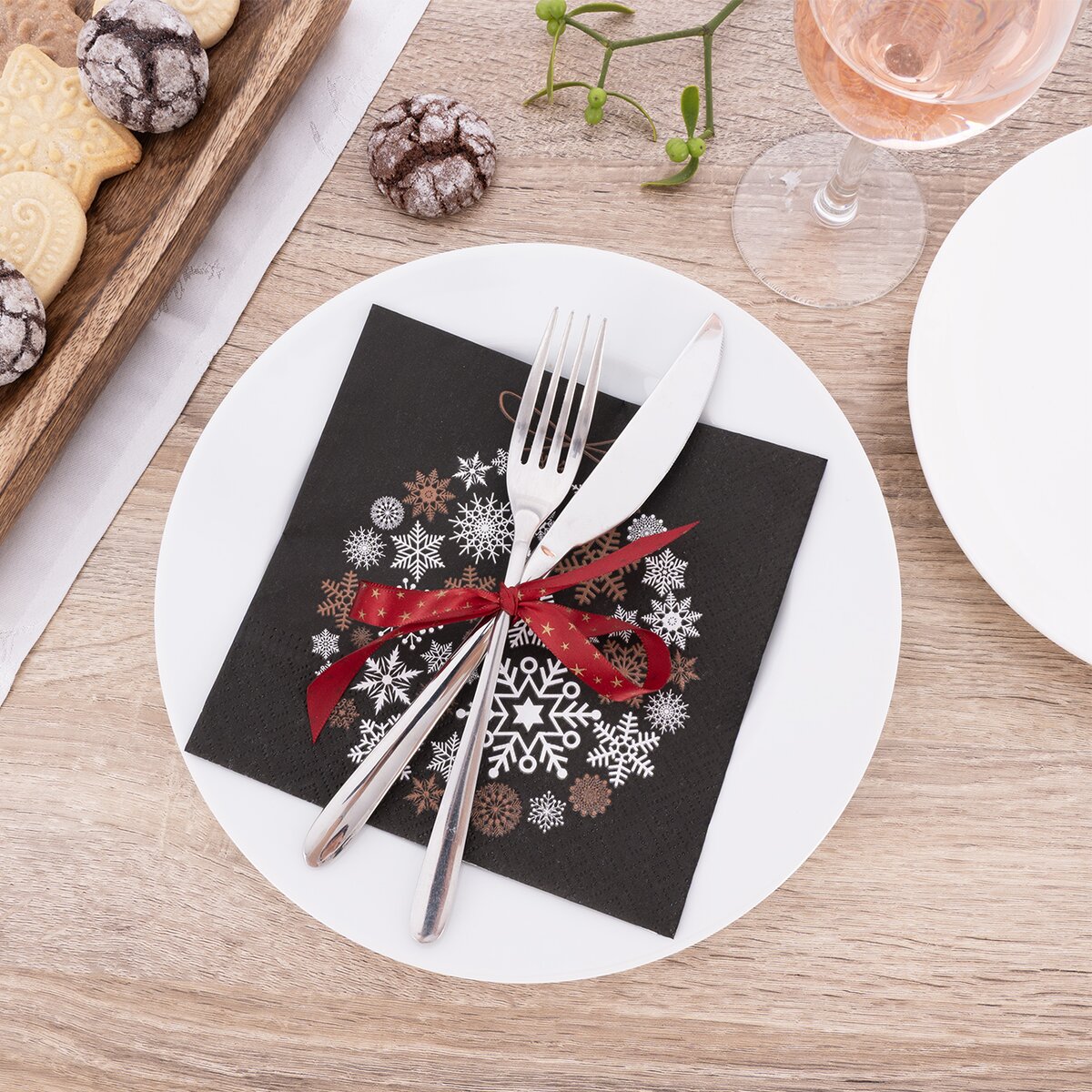 Kód produktu 842377Súprava 20 ks papierových obrúskov v čiernej, trendovej farbe. Obrúsky majú veľkosť 33x33 cm a doplnia prestretý stôl počas vianočných sviatkov aj v období Adventu.