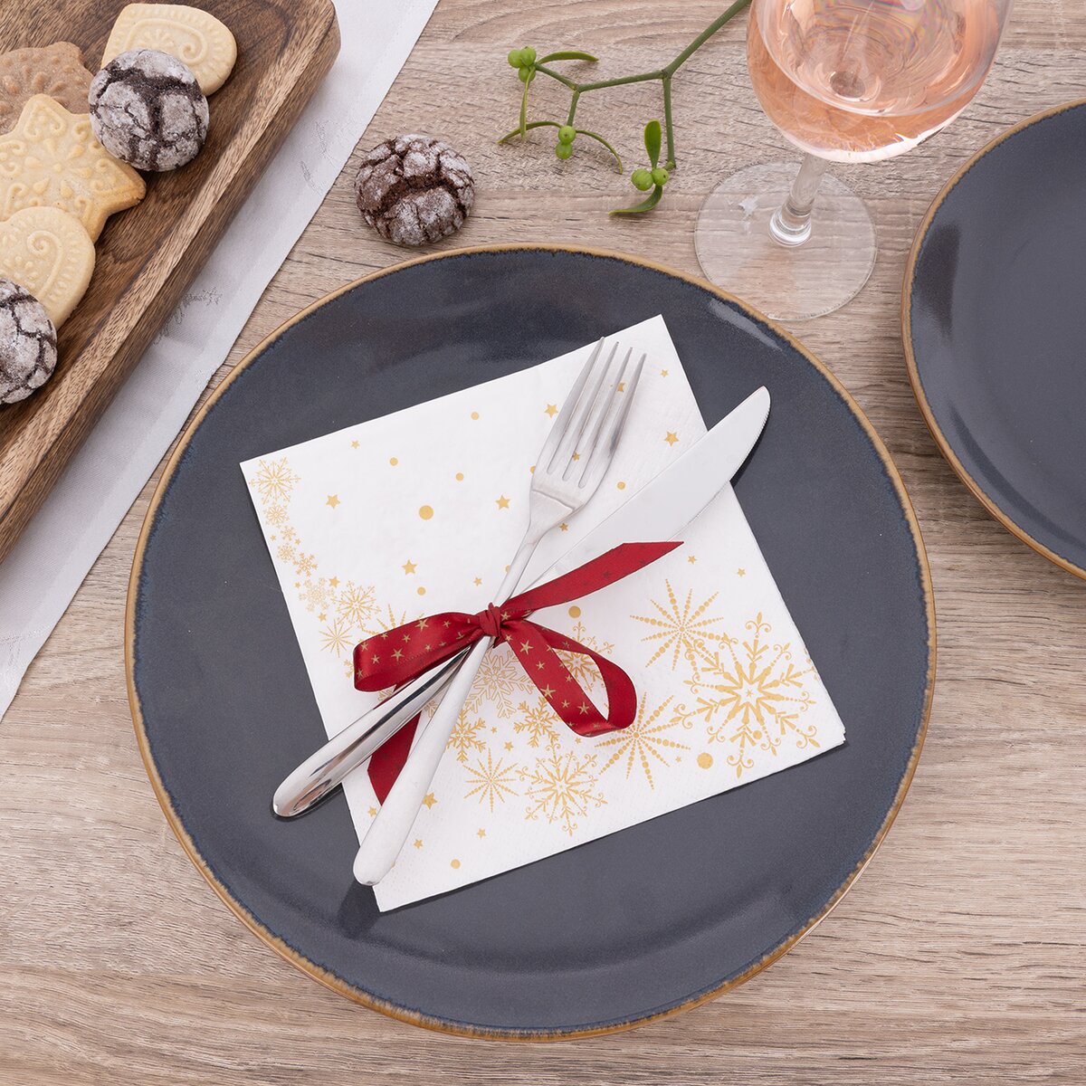 Kód produktu 842369Sada 20 ks svetlých papierových obrúskov je zdobená hviezdičkami a snehovými vločkami v zlatom odtieni. Obrúsky majú veľkosť 33x33 cm a doplnia prestretý stôl počas vianočných sviatkov aj v období Adventu.