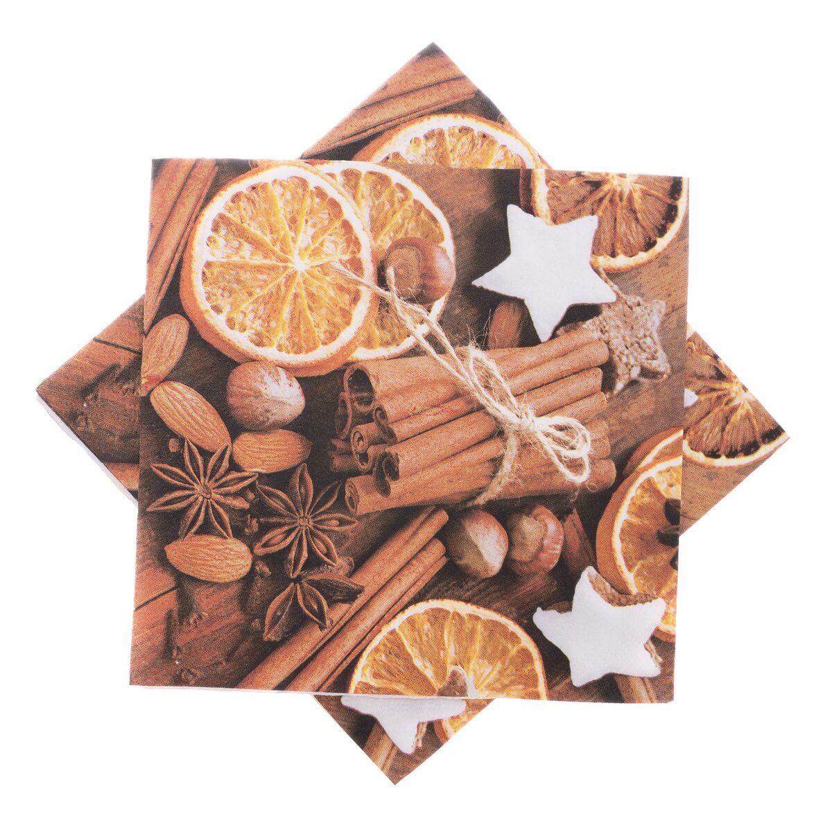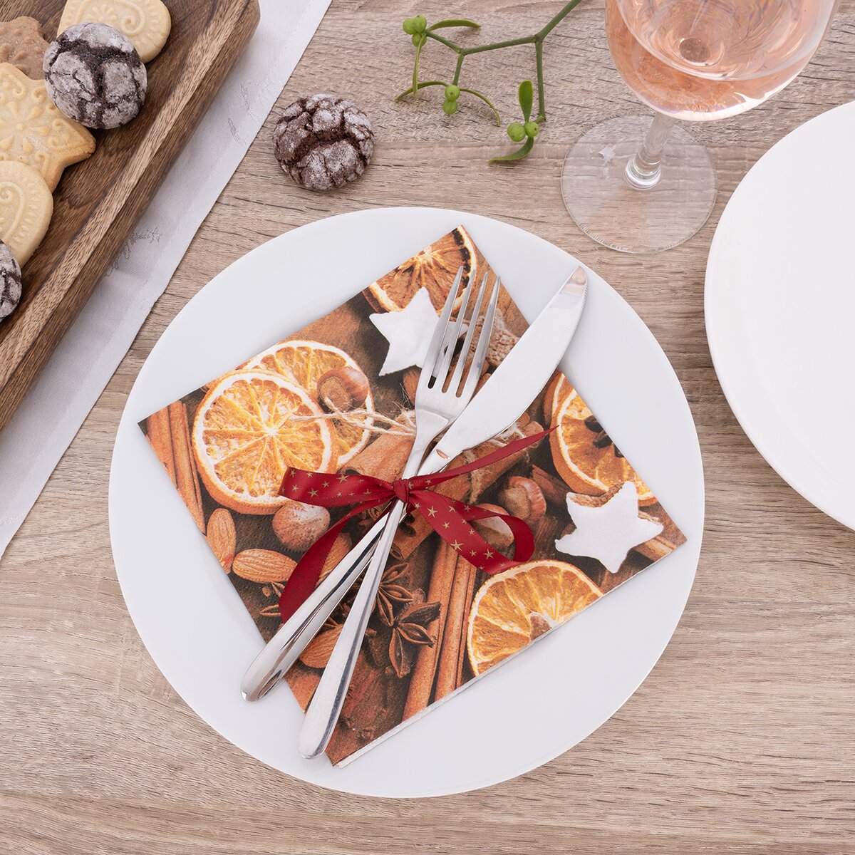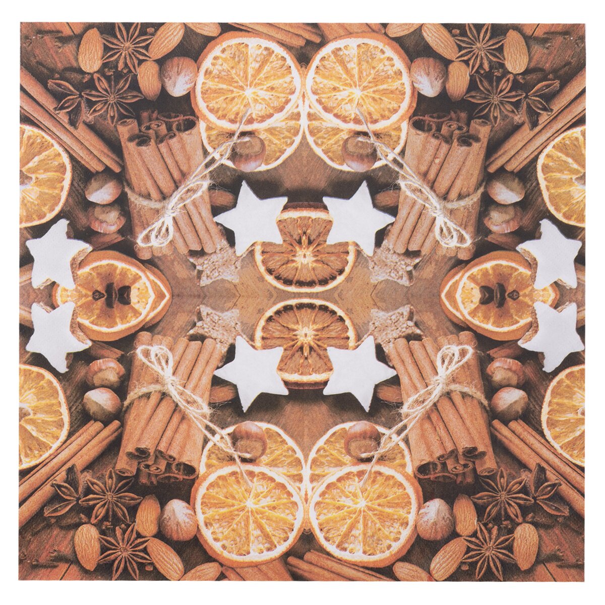 Kód produktu 842378Súprava 20 ks papierových obrúskov je zdobená vianočným motívom plným škorice a sušených pomarančov. Obrúsky majú veľkosť 33x33 cm a doplnia prestretý stôl počas vianočných sviatkov aj v období Adventu.