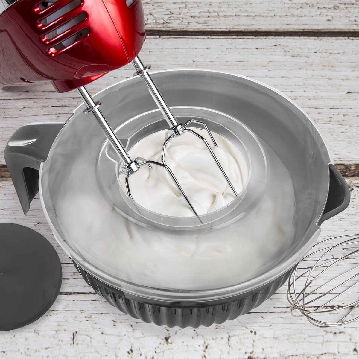 Návod, ako misu používať: Pred šľahaním stačí odklopiť stredovú časť viečka, čím sa uvoľní priestor pre šľahacie metly. Druhý diel viečka zabráni rozstrekovaniu, ochráni kuchynskú linku pred zašpinením. Aby ušľahané dobroty neosychli, stačí znovu priklopiť stredovú časť viečka k zvyšku nádoby. Je možné ju umývať v umývačke riadu.