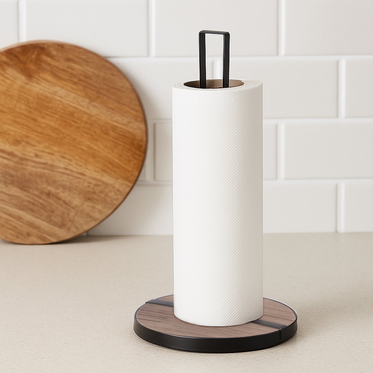 Stojan na papierové utierky zaistí, že budú mať svoje stále miesto na kuchynskej linke alebo pri stole. Je kombináciou drevovláknitej dosky MDF a základne s tyčou z kovu s čiernym nástrekom.