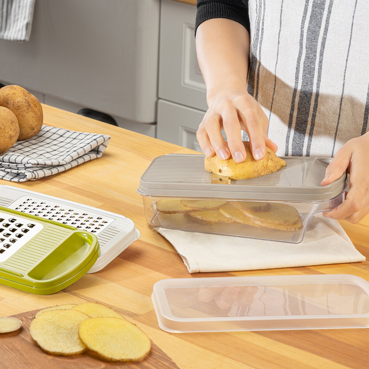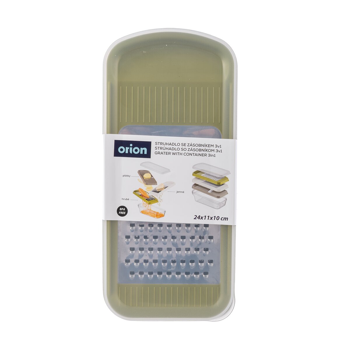 Kód produktu 144813Strúhadlo so zásobníkom je praktickým pomocníkom do každej kuchyne, ktorý uľahčuje prípravu potravín. Disponuje veľkou strúhacou plochou, vďaka ktorej je práca rýchla a efektívna. Súčasťou sú tri vymeniteľné nástavce umožňujúce rôzne druhy strúhania i krájania na plátky, takže ho možno využiť na širokú škálu surovín. Nastrúhané potraviny sa zhromažďujú priamo v zásobníku, ktorý je možné jednoducho uzavrieť vekom a uložiť napríklad do chladničky bez toho, aby bolo nutné obsah presypávať. Ergonomické a ľahké uchytenie zaisťuje pohodlnú a bezpečnú manipuláciu počas krájania, čo oceníte pri každodennom používaní. Výrobok je BPA-free. Materiál: plast PPR (viečko) + plast PS (zásobník) + plast ABS (nástavce) + nerezová oceľ. Rozmery: 24x11x10 cm. Možno umývať v umývačke.