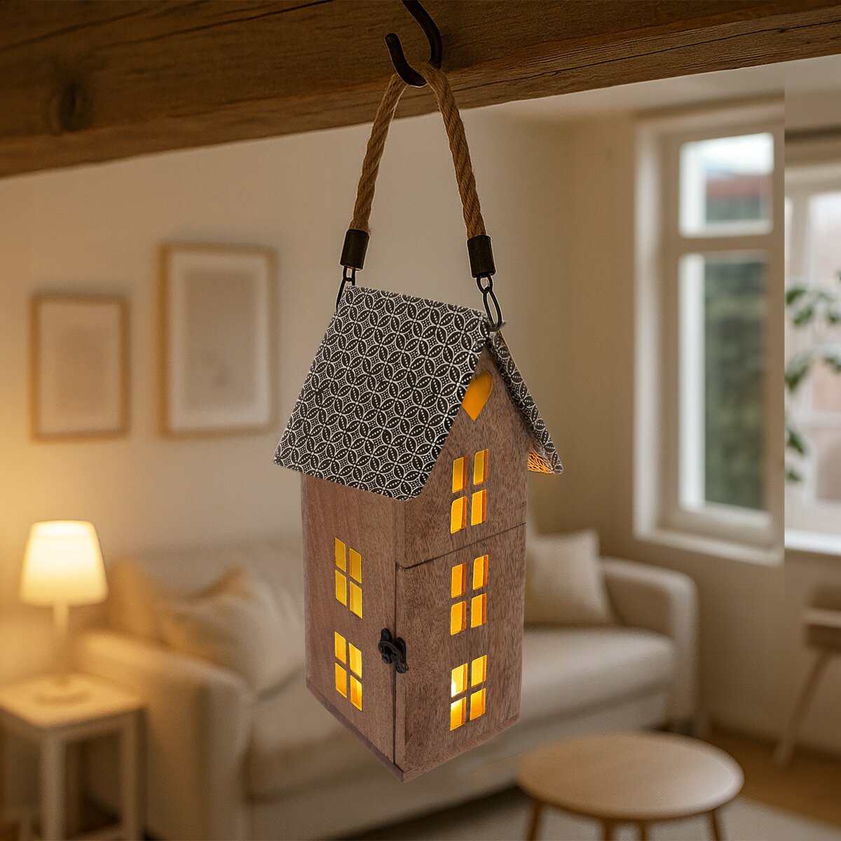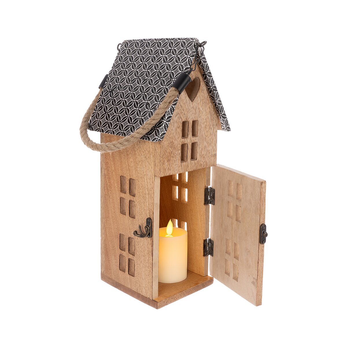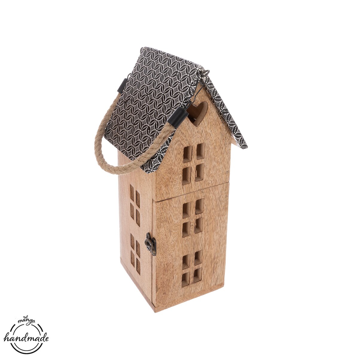 Kód produktu 351901Svietnik z mangového dreva v tvare domčeka bude krásnym a štýlovým prvkom interiéru počas celého roka. Jeho prírodný materiál a originálny dizajn v podobe domčeka dodajú priestoru útulnú atmosféru. Je určený na použitie s LED sviečkou, ktorej jemné svetlo krásne presvitá okienkami von a vytvára príjemnú, útulnú atmosféru. Skvele poslúži ako vkusný a nápaditý darček. Materiál: mangové drevo, kov, juta. Rozmery: 15x18x36 cm.