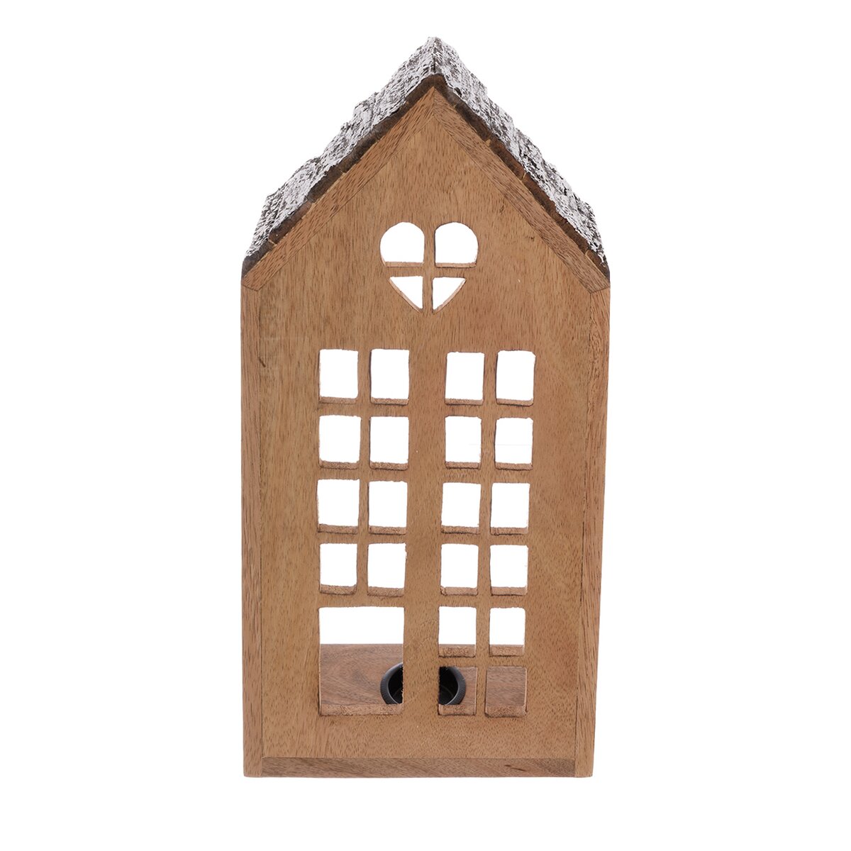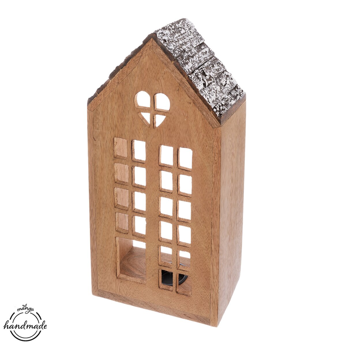 Kód produktu 351902Svietnik z mangového dreva v tvare domčeka bude krásnym a štýlovým prvkom interiéru počas celého roka. Jeho prírodný materiál a originálny dizajn v podobe domčeka dodajú priestoru útulnú atmosféru. Uprostred svietnika sa nachádza stojan určený na čajovú sviečku. V prípade jej použitia však nenechávajte svietnik bez dozoru a vždy dohliadnite na to, aby plameň nesiahal príliš vysoko. Pre väčšiu bezpečnosť môžete namiesto klasickej sviečky použiť aj bezpečnú variantu v podobe LED sviečky. Skvele poslúži ako vkusný a nápaditý darček. Materiál: mangové drevo, kov. Rozmery: 19,5x10x38,5 cm.