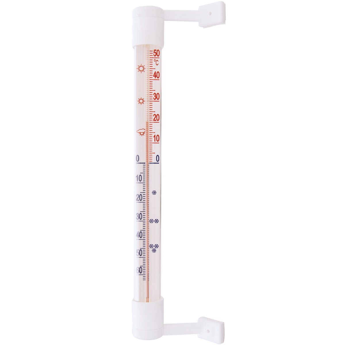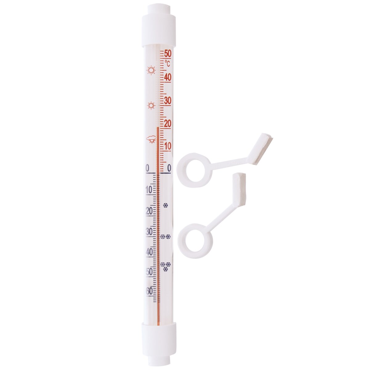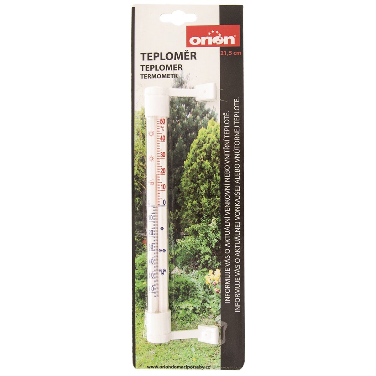 Teplomer využijete na meranie vonkajšej aj vnútornej teploty. Stupnica od - 55 ° C do 50 ° C. Materiál: plast, sklo, kerosín s farbivom. Pripevníte pomocou lepiacej pásky (napr. na plastový rám okna), nemusíte vŕtať do steny. V prípade tohto spôsobu pripevnenia je potrebné plochu pred prilepením dôkladne očistiť, odmastiť a osušiť. Môžete ho ale pripevniť aj klasicky pomocou klinčekov/skrutiek (nie sú súčasťou balenia). Možno upraviť smer úchytov s lepiacou plochou. Teplomer upevnite na miesto, ktoré nie je vystavené priamemu slnečnému žiareniu. Bez ortuti. Rozmery: d. 21,5 cm, š. 2 cm.