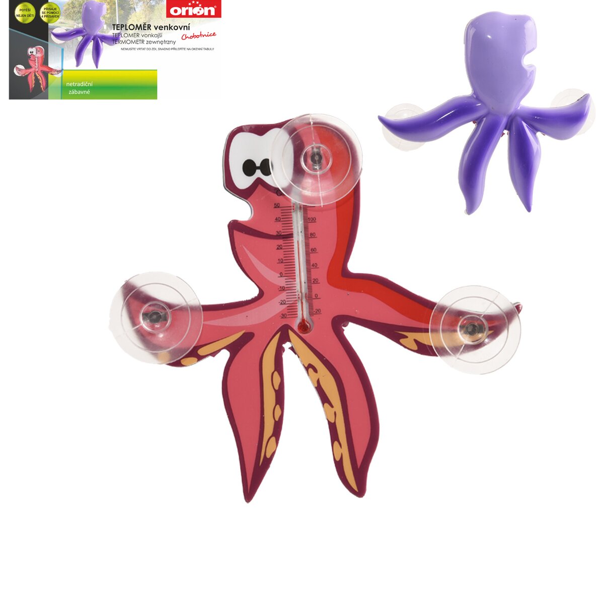 Teplomer vonkajší na okno CHOBOTNICA poteší deti a informuje Vás o aktuálnej vonkajšej teplote. Pripevňuje sa na okno pomocou 3 prísaviek. Meria teplotu v °C a °F. Stupnice od -30°C do +50°C a od -20°F do +120°F. Materiál: plast. Rozmery: 16x16x3 cm.